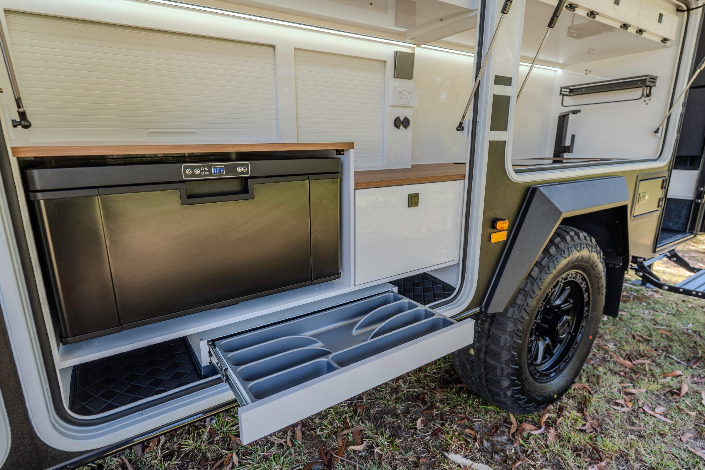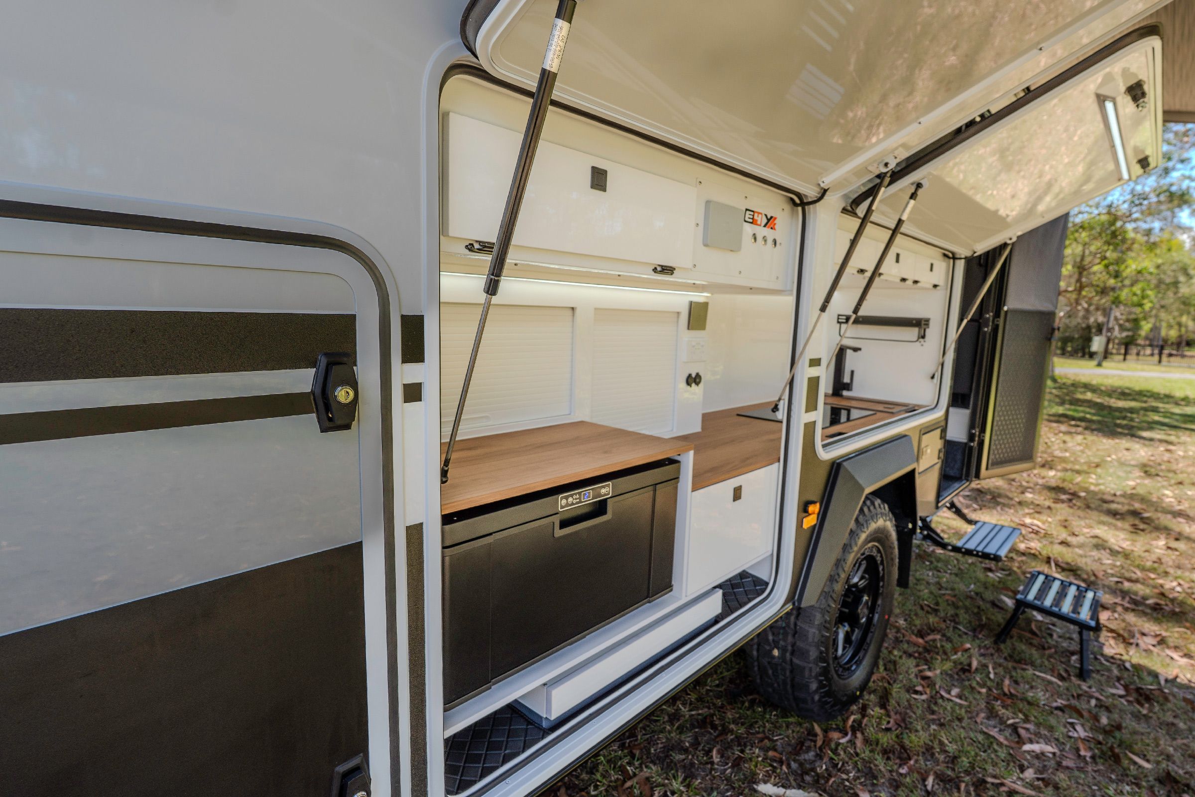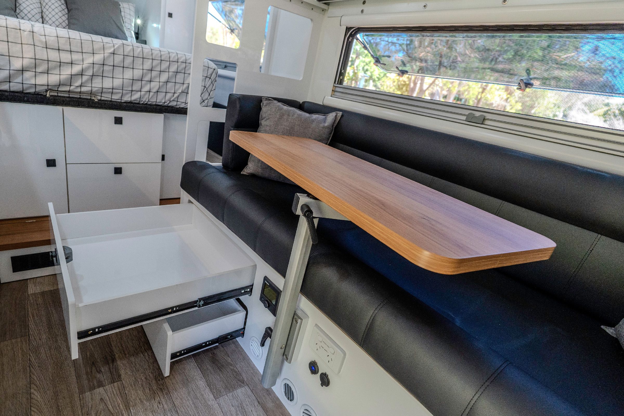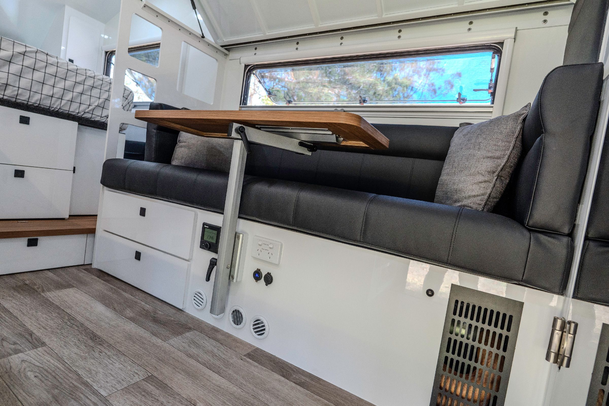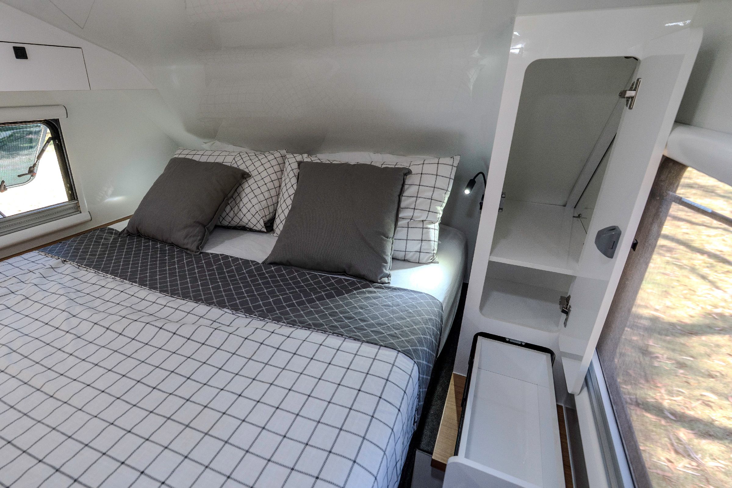 The Pop Top boasts a lower travel height of 2640mm for improved aerodynamics, fuel efficiency and access under low-clearance environments. The new High Top (solid roof) stands at 2940mm travel height, providing a permanent full-height interior that eliminates set-up time altogether and offers greater cabinetry and storage options. Both models retain identical widths and body lengths, ensuring ease of towing and true off-road manoeuvrability.