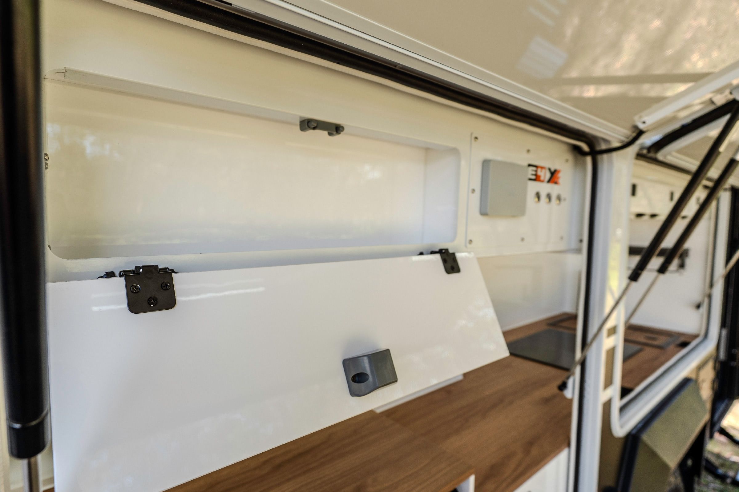 The Pop Top features an insulated one-piece composite roof with automatic electric actuators for effortless setup. The High Top replaces this system with a full-height composite insulated solid roof and composite side frames, delivering excellent rigidity, no moving roof components and increased storage and overhead cabinetry inside.