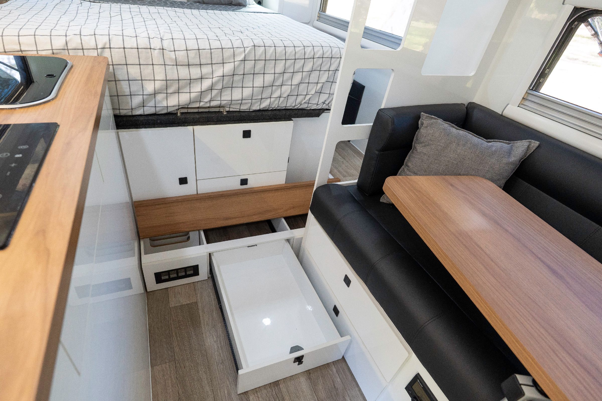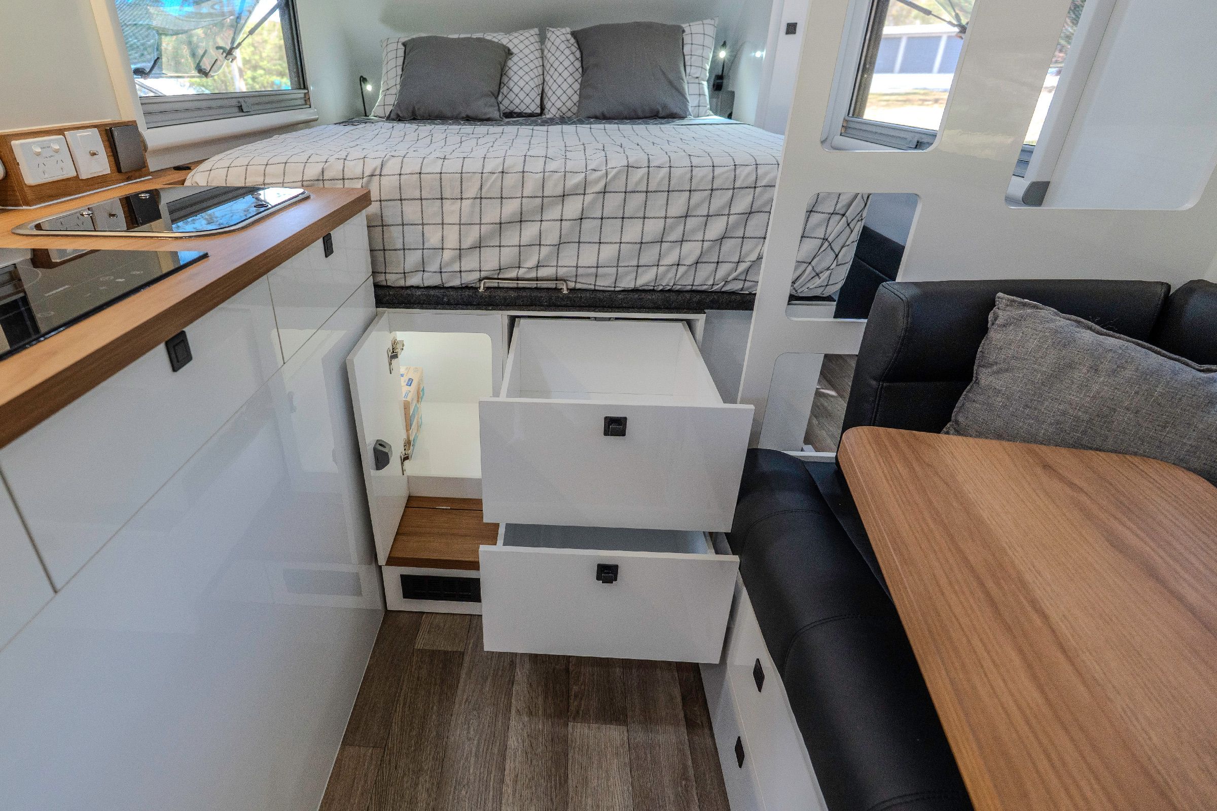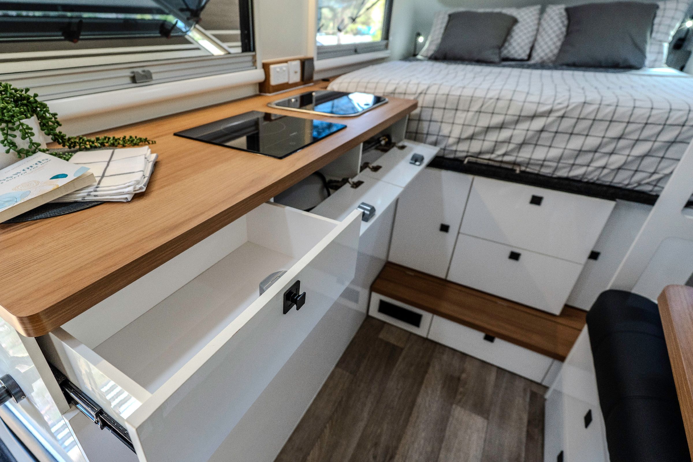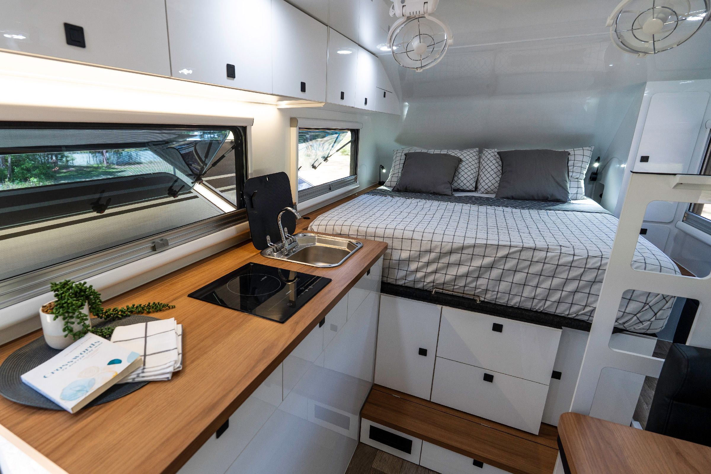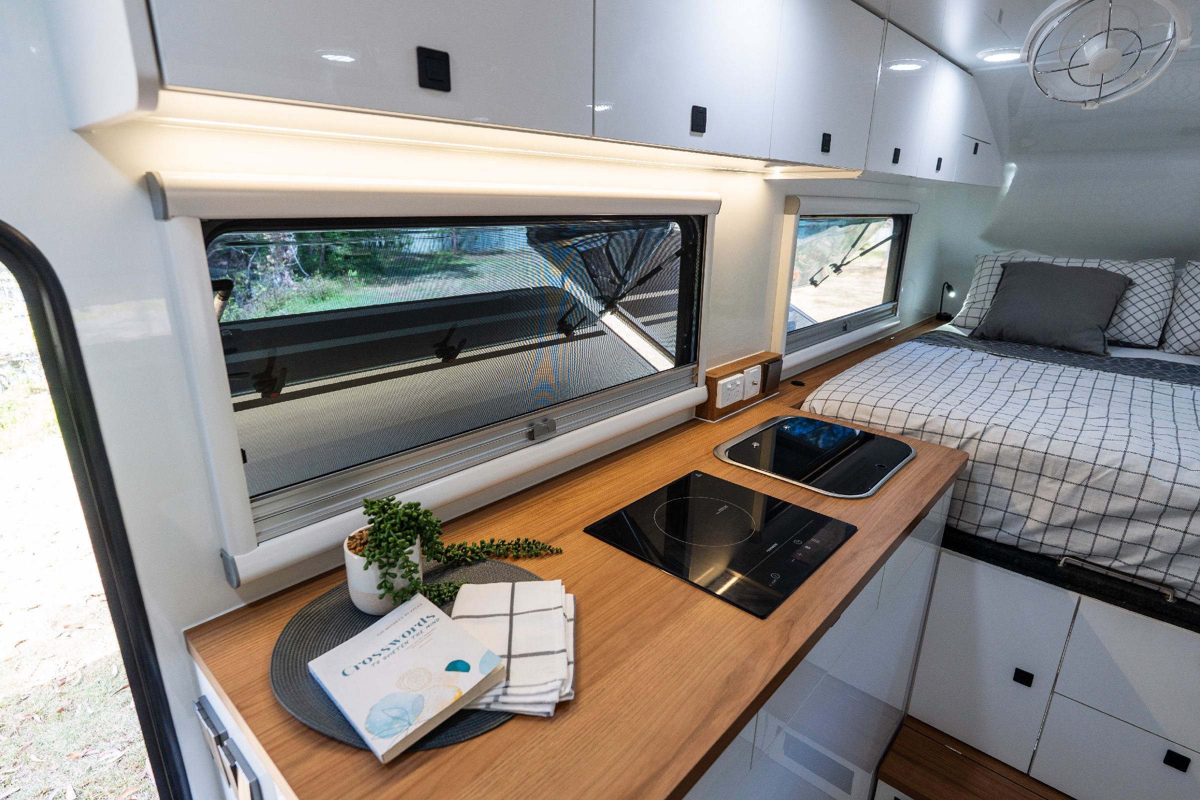 Both models share Lifestyle’s exclusive XK gourmet kitchen and butler’s pantry with induction cooktop, stainless sink, under-bench cabinetry and overhead storage. Complete with 40L fridge drawer, roller pantries, large drawers, overhead cabinetry, and integrated Victron Cerbo touch screen. This setup delivers a true residential-style kitchen in a compact touring van.