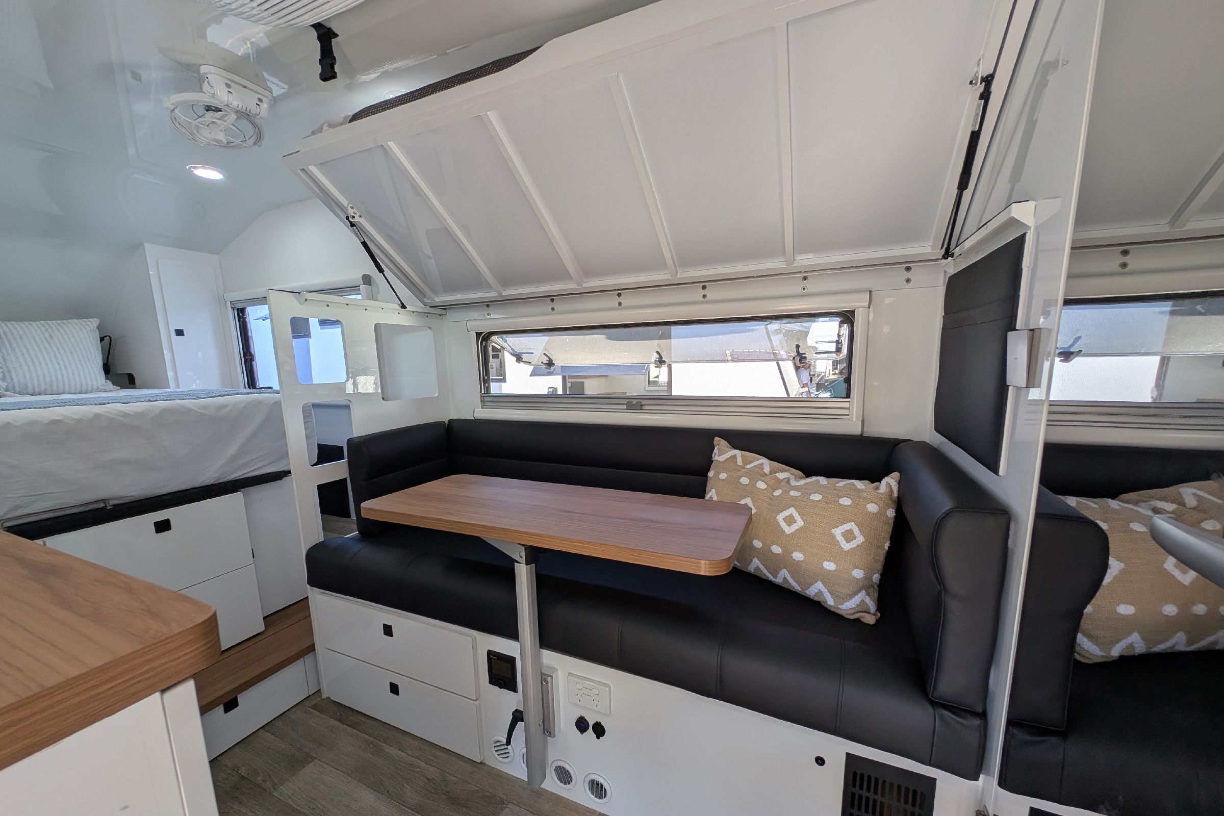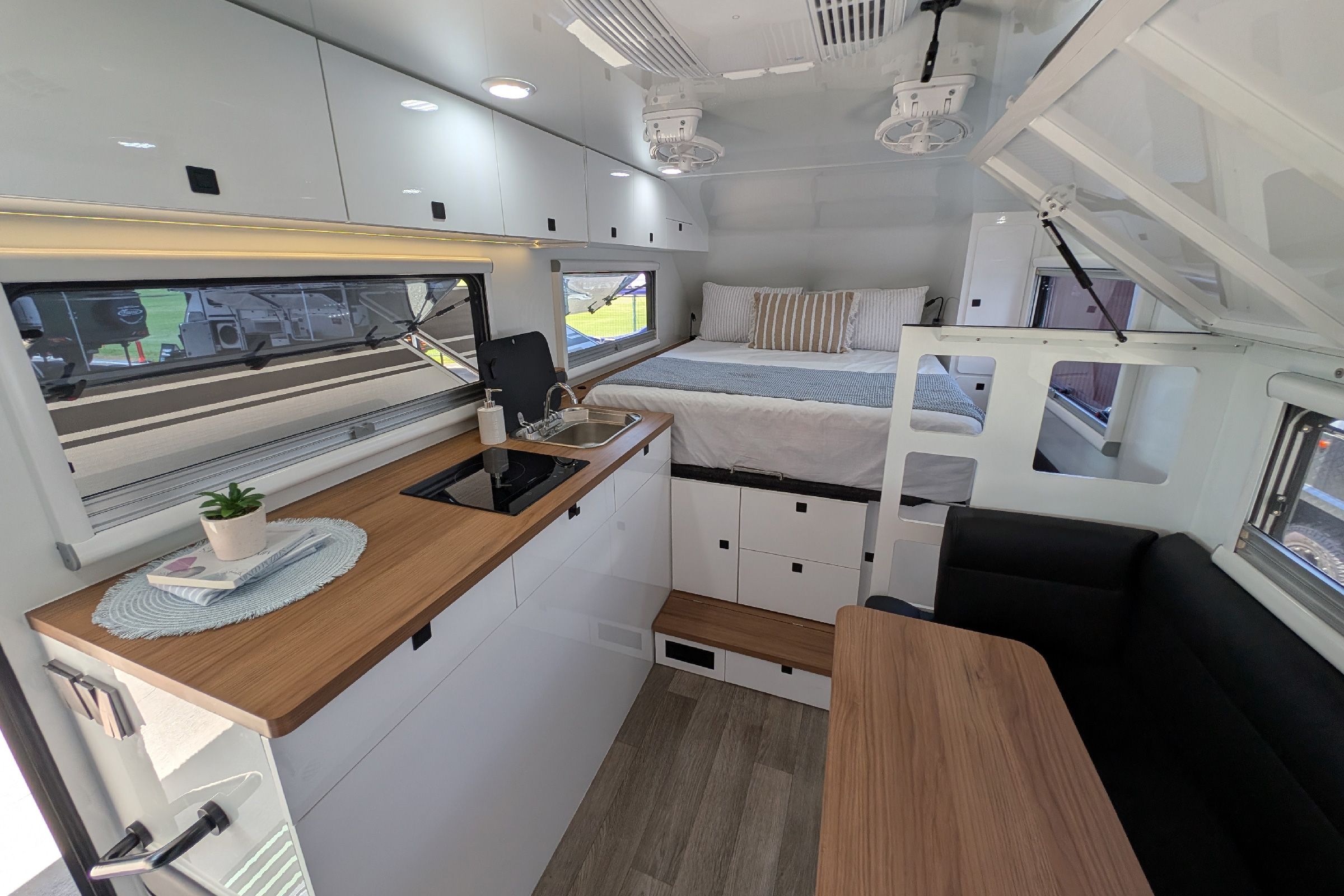 Inside, both layouts offer a semi island queen-size island bed, combined ensuite, and your choice of café dinette, lounge dinette or bunk layout options. The High Top introduces fixed full-height overhead cabinetry, built-in microwave placement, internal induction cooking and increased internal storage, while the Pop Top retains its large internal bench layout and open-air feel once the roof is lifted.