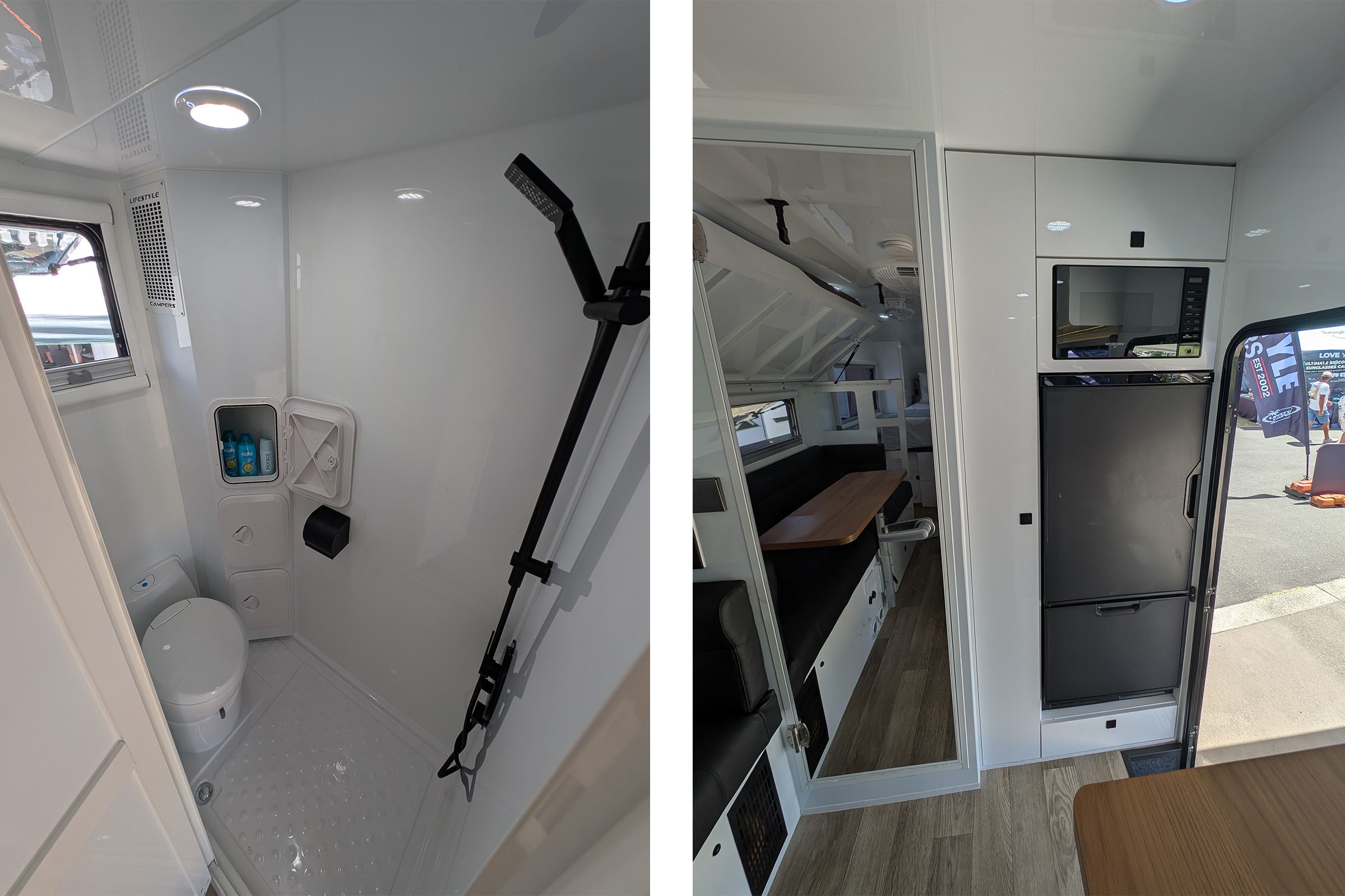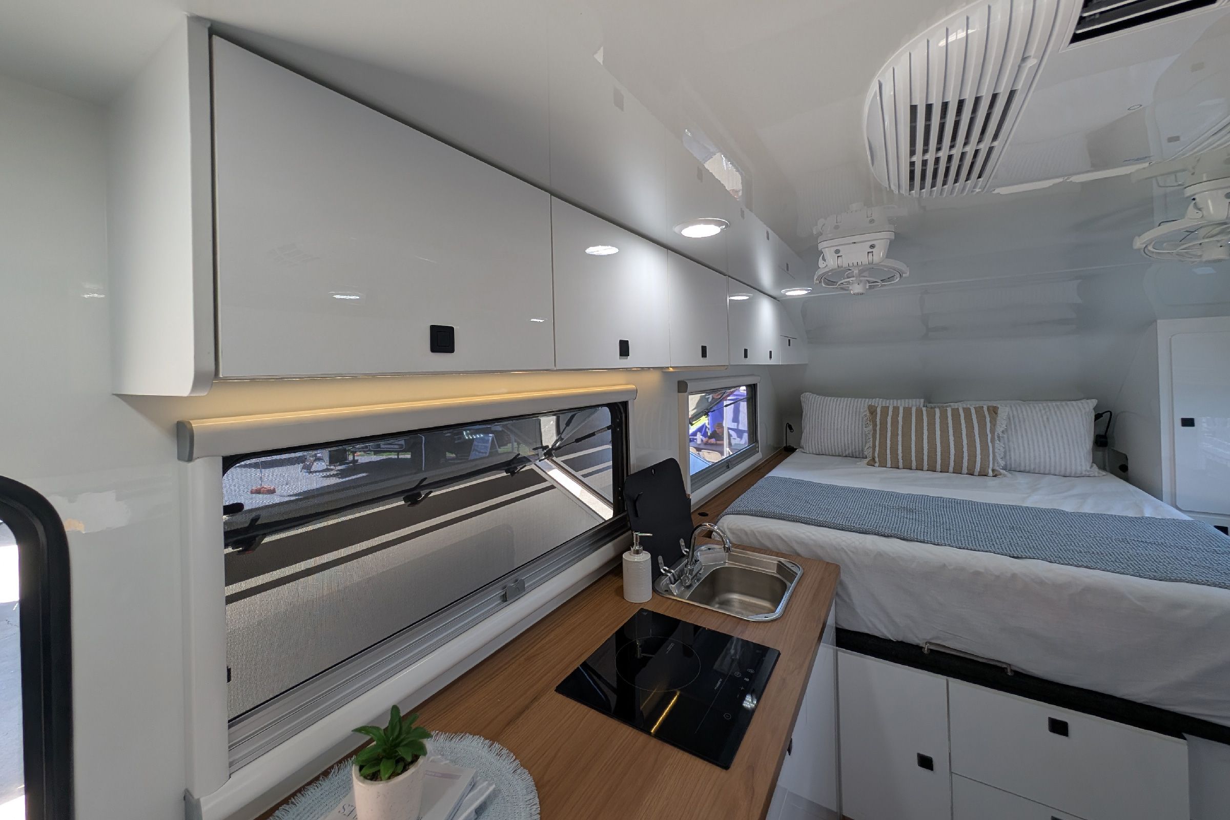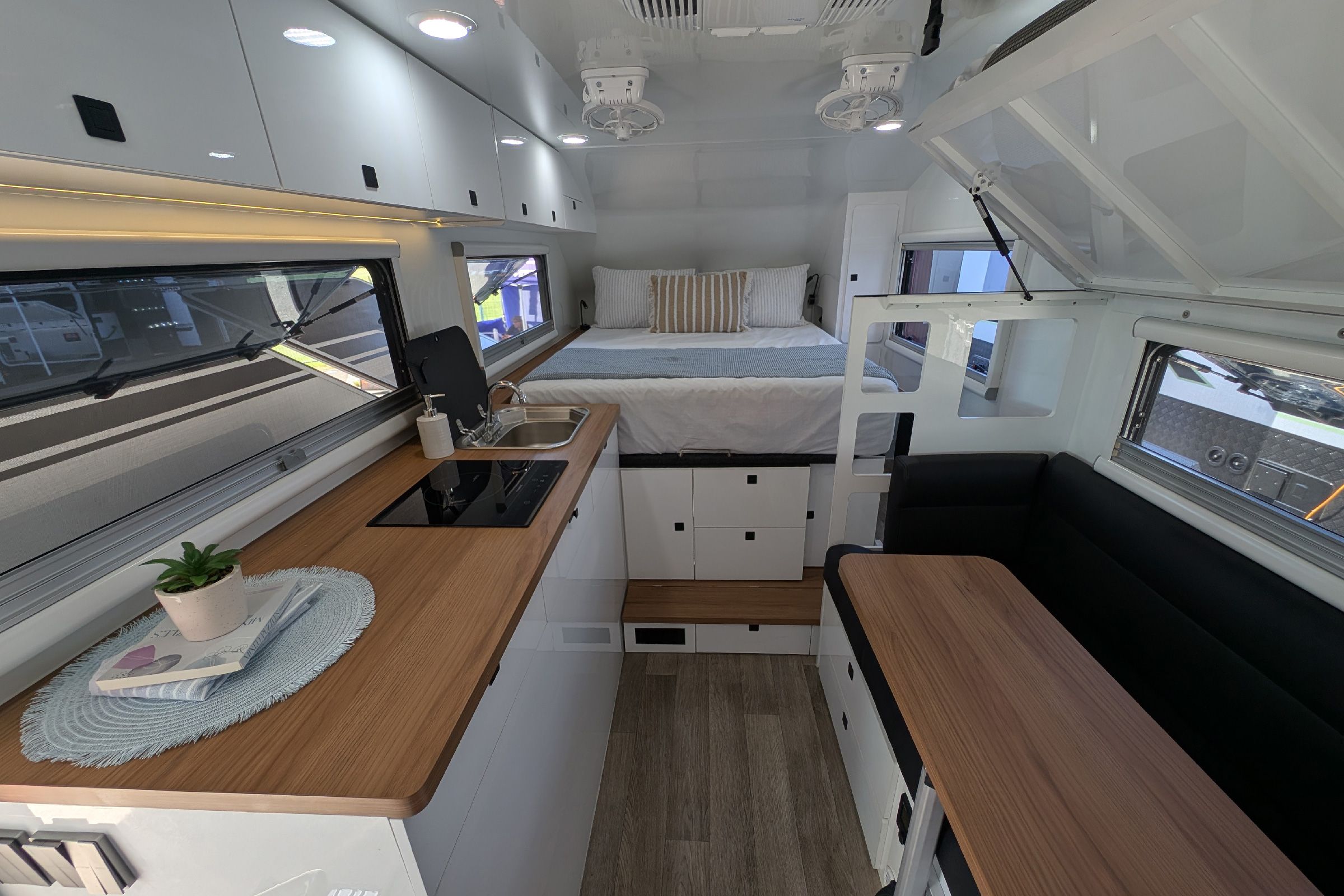 Both models share Lifestyle’s exclusive XK gourmet kitchen and butler’s pantry with induction cooktop, stainless sink, under-bench cabinetry and overhead storage. Complete with 40L fridge drawer, roller pantries, large drawers, overhead cabinetry, and integrated Victron Cerbo touch screen. This setup delivers a true residential-style kitchen in a compact touring van.