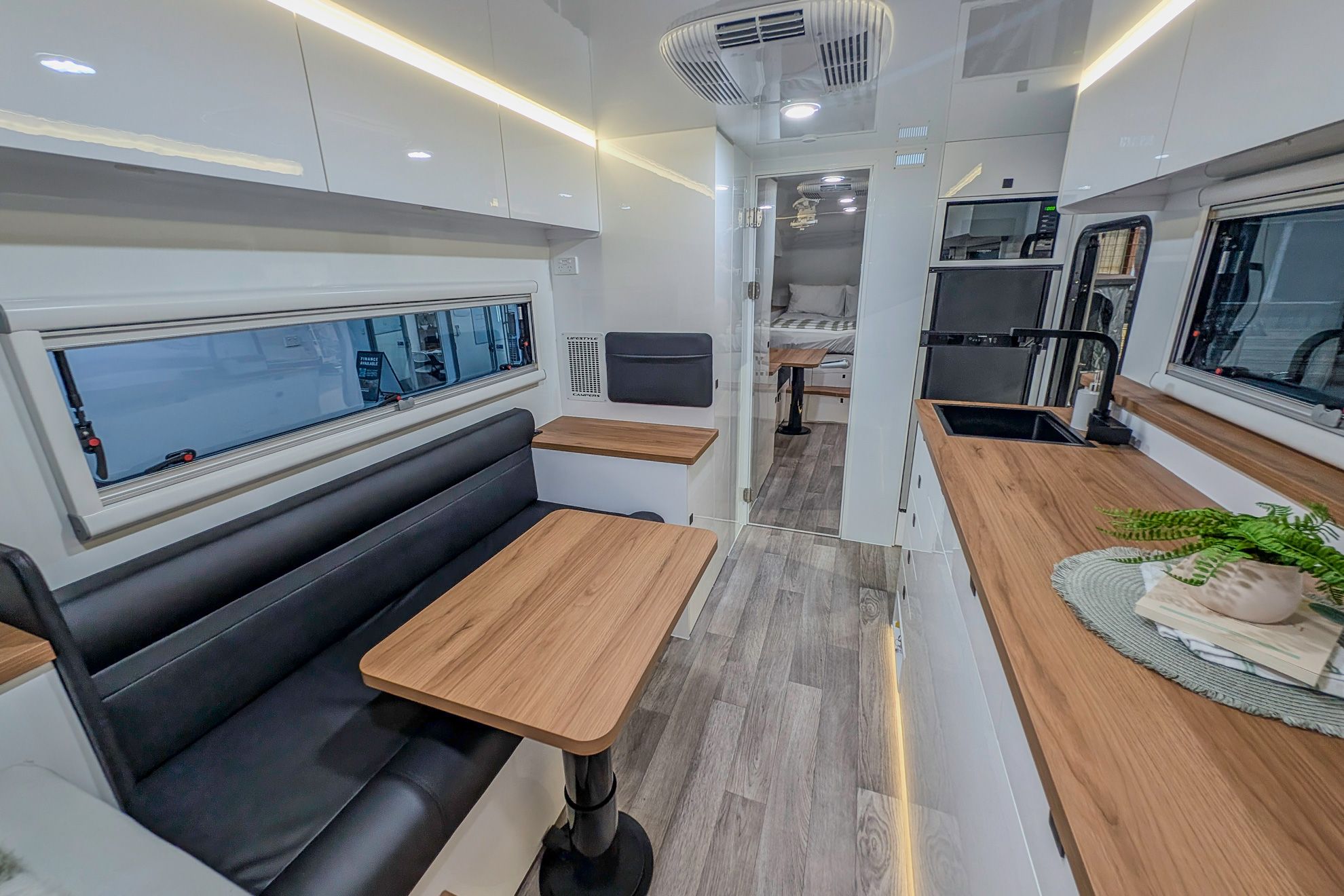 The interior is designed to impress. A queen size pillow top innerspring mattress anchors the sleeping space, supported by bedside storage and reading lights with USB. Climate control includes diesel hot water and space heating, roof mounted air conditioning, and dual internal roof fans. A 202 L two door internal fridge freezer and integrated microwave complete a space intended for long term touring.