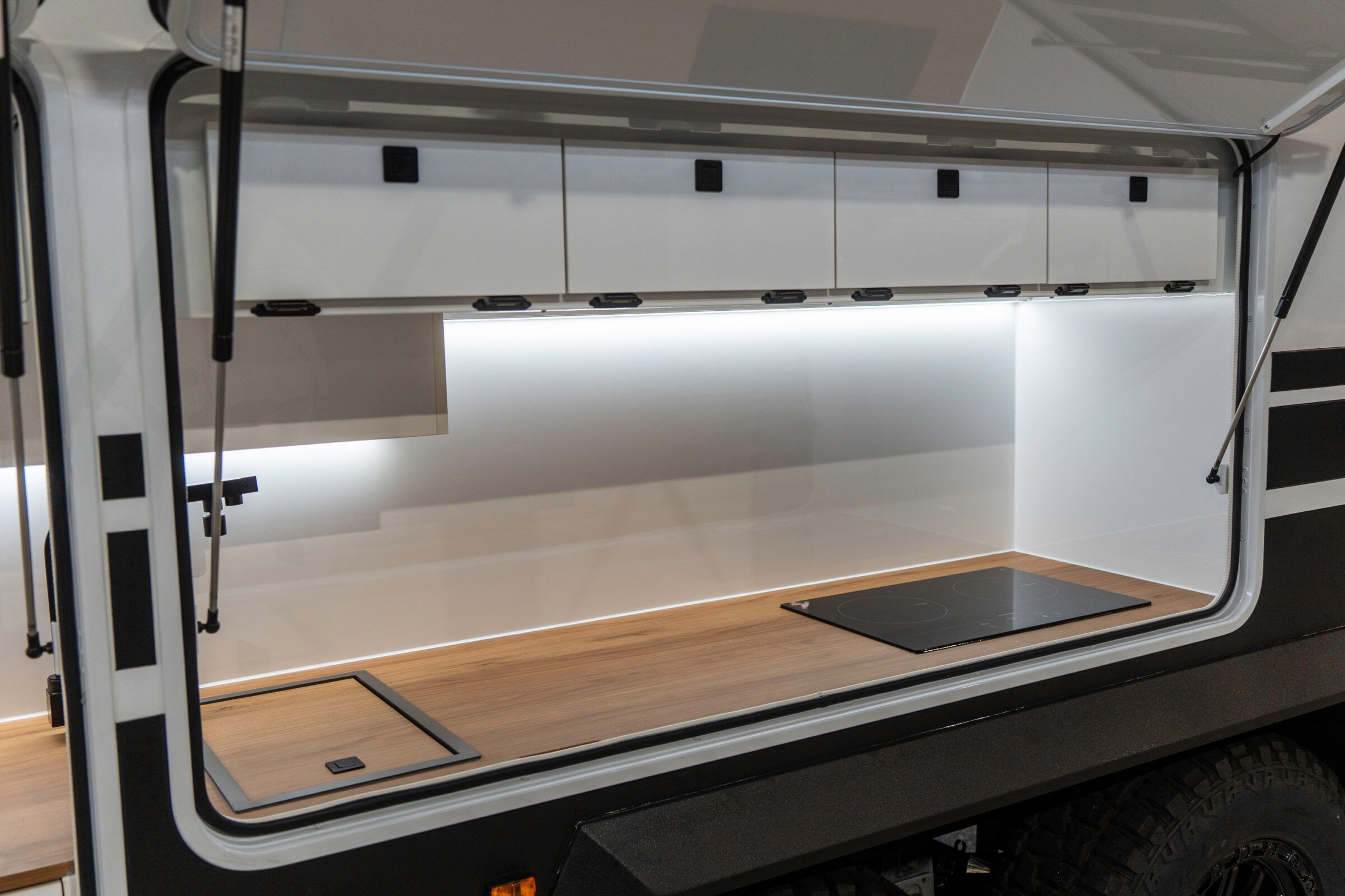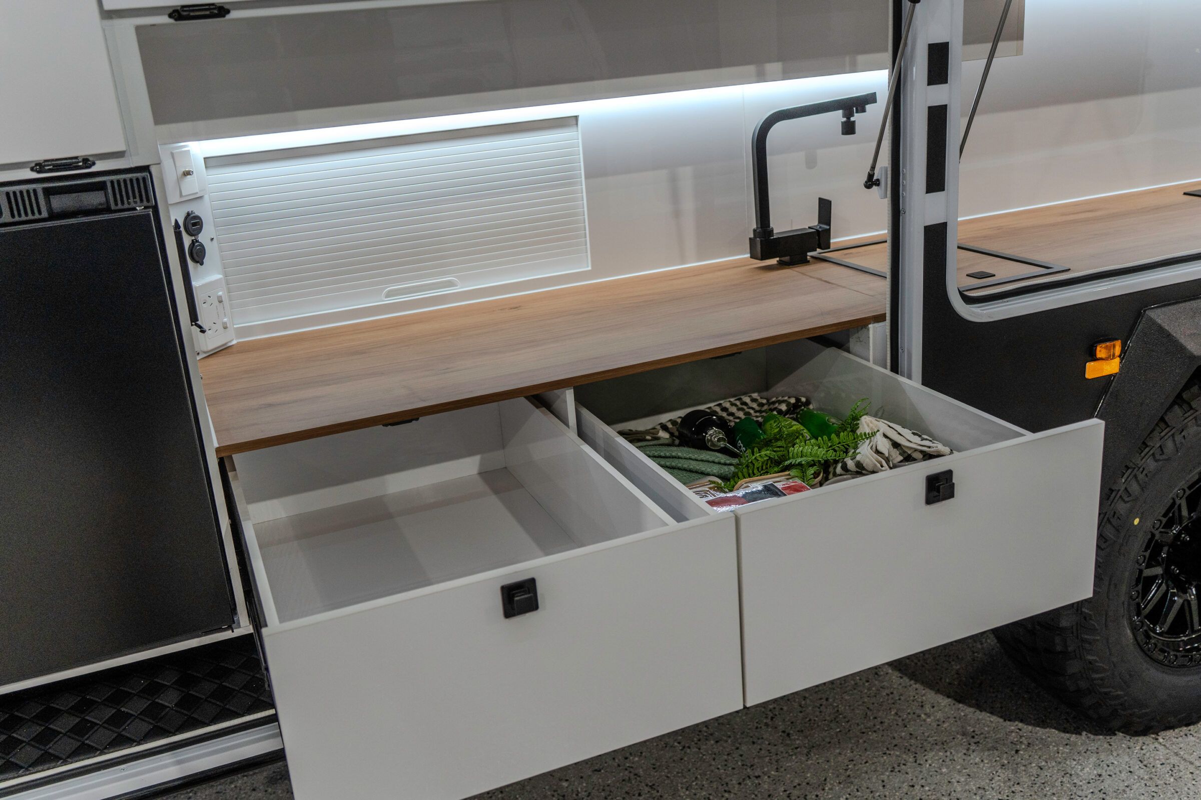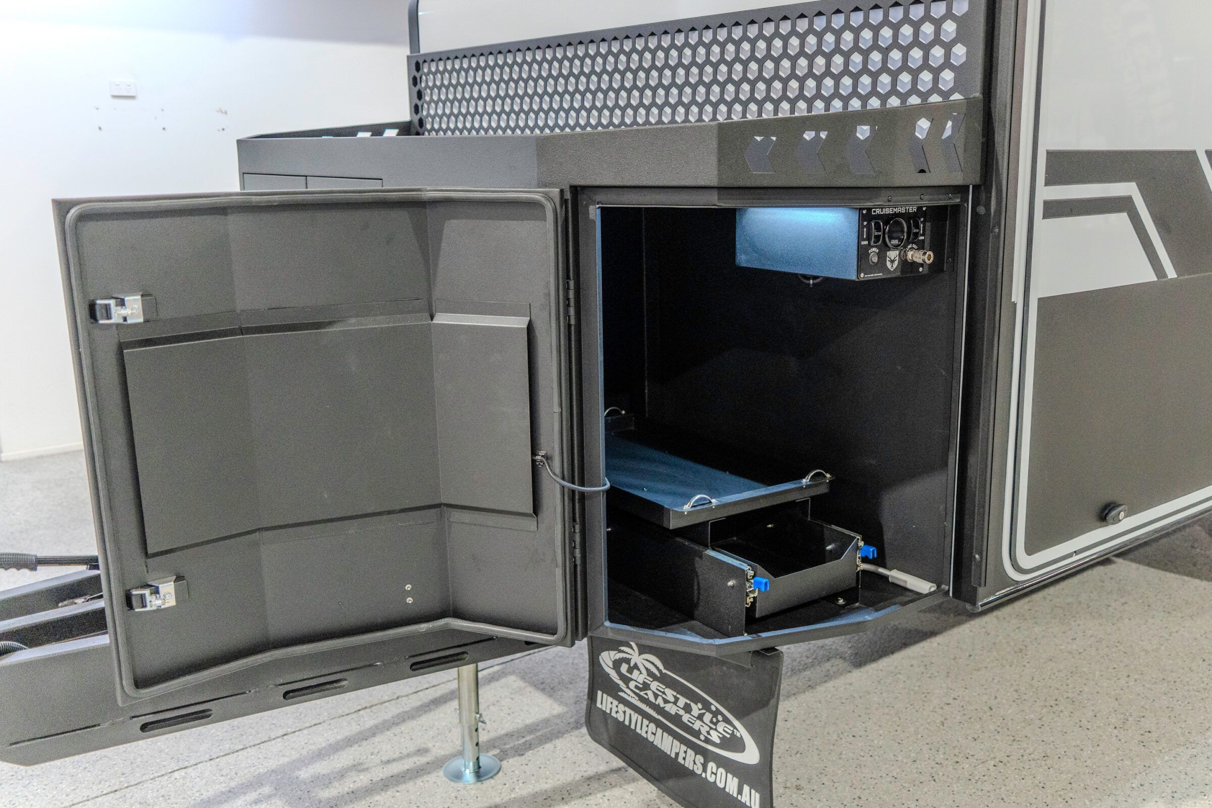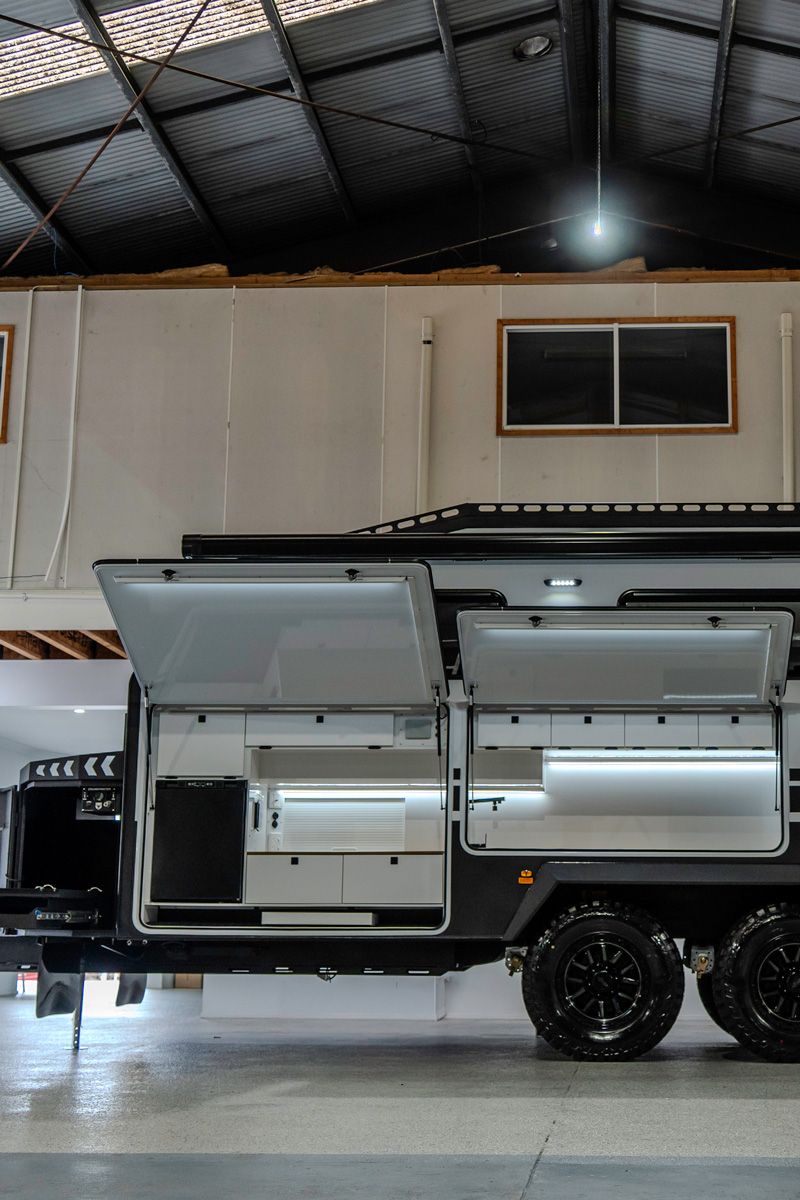 Lifestyle Campers pioneered the external kitchen concept and this design in 2014, reshaping outdoor living. In the Iconn XKT, that legacy is refined. Induction cooking, sink, storage, and tricolour lighting are arranged with precision. The butler’s pantry extends capability with a 72 L upright fridge freezer, deep pantry drawers, roller door storage, integrated power, and a Victron Cerbo touch screen. This is a system refined through evolution.
