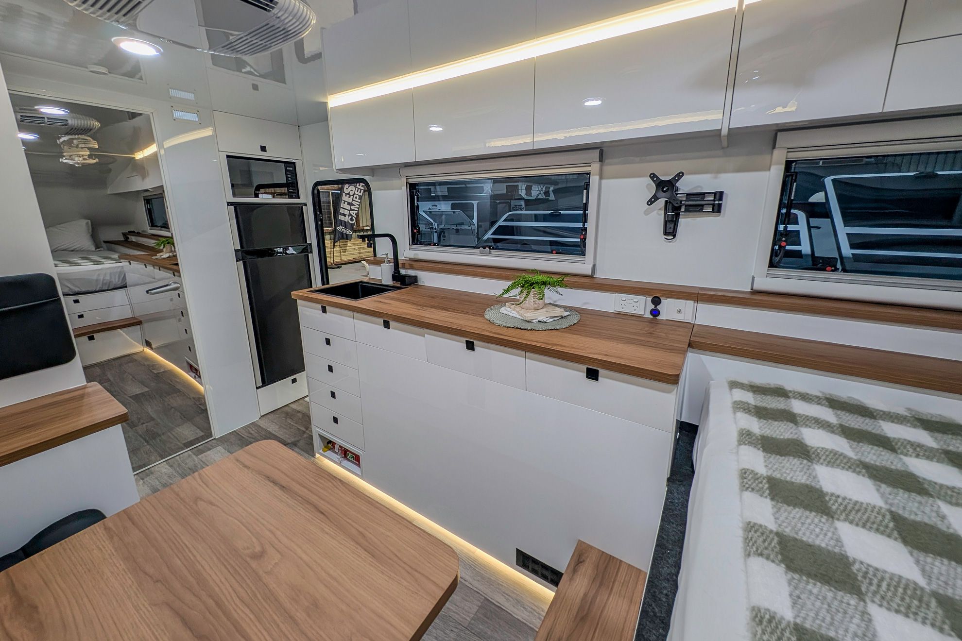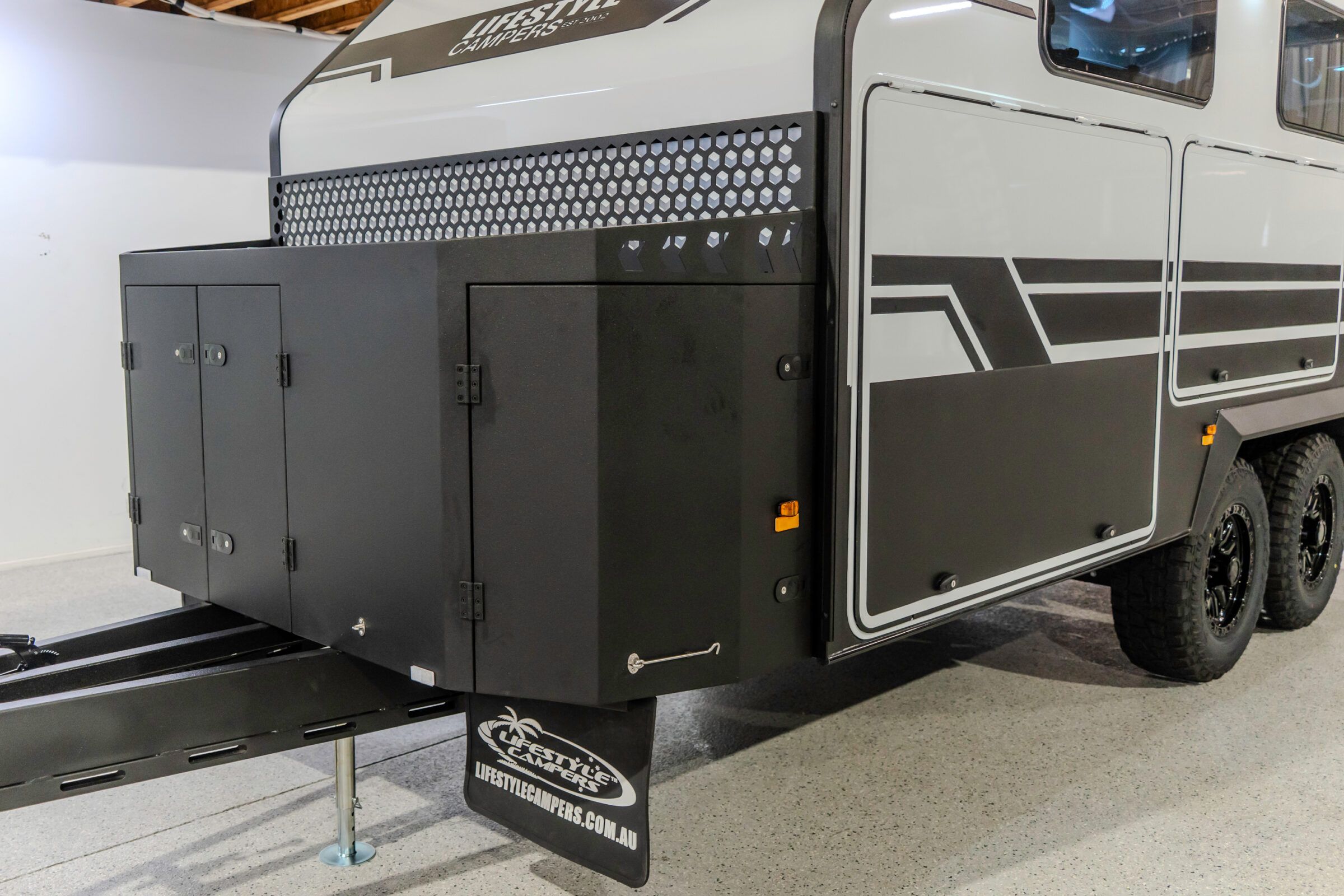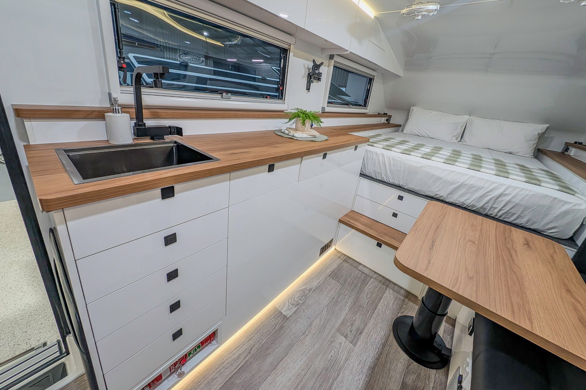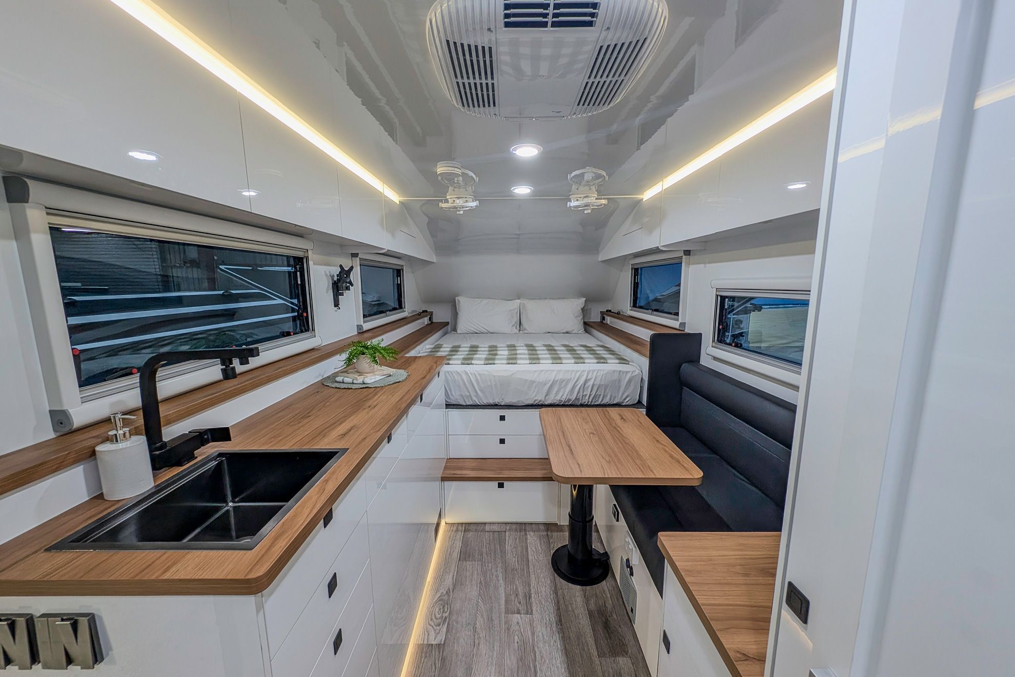 Lifestyle Campers pioneered the external kitchen concept and this design in 2014, reshaping outdoor living. In the Iconn XKT, that legacy is refined. Induction cooking, sink, storage, and tricolour lighting are arranged with precision. The butler’s pantry extends capability with a 72 L upright fridge freezer, deep pantry drawers, roller door storage, integrated power, and a Victron Cerbo touch screen. This is a system refined through evolution.