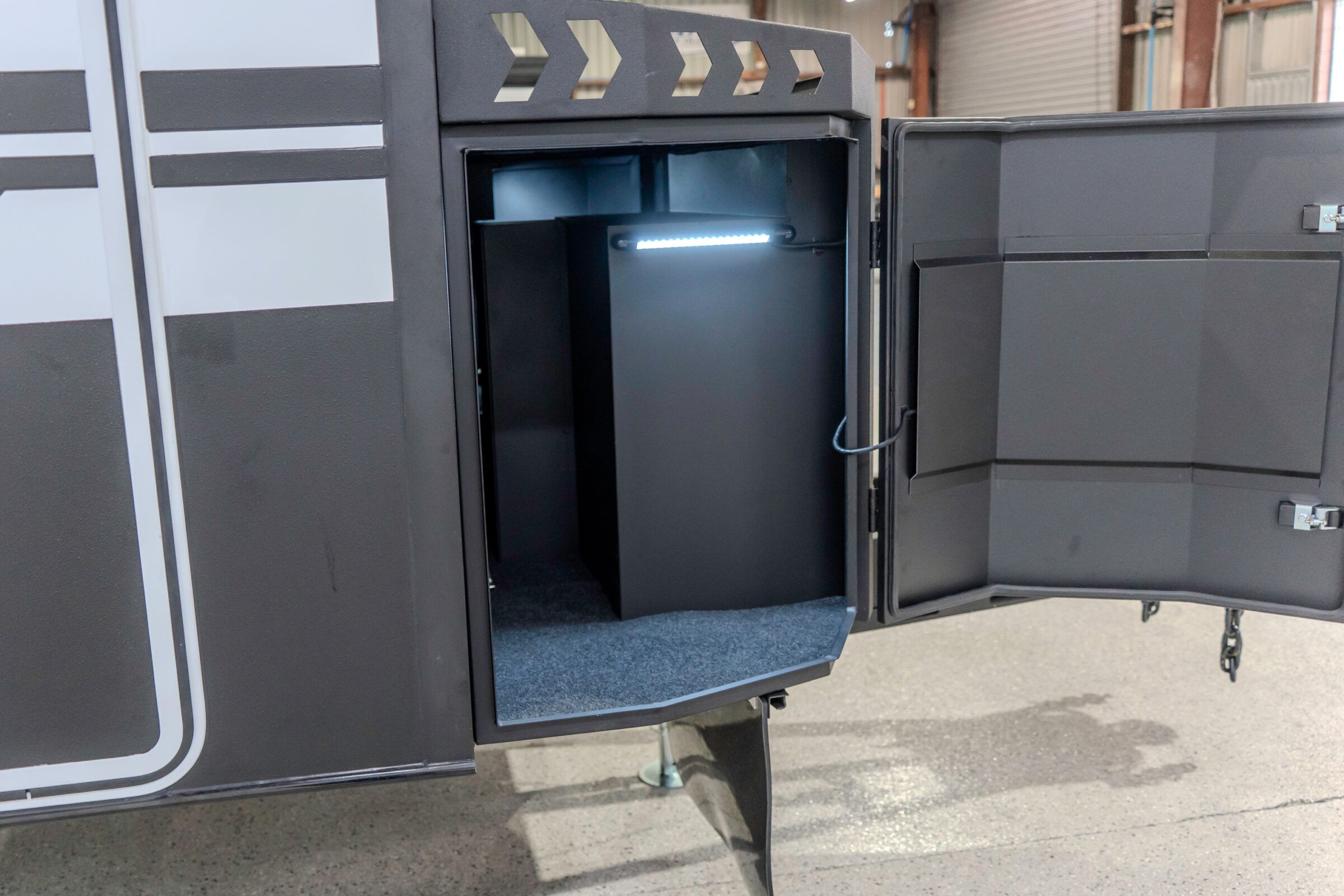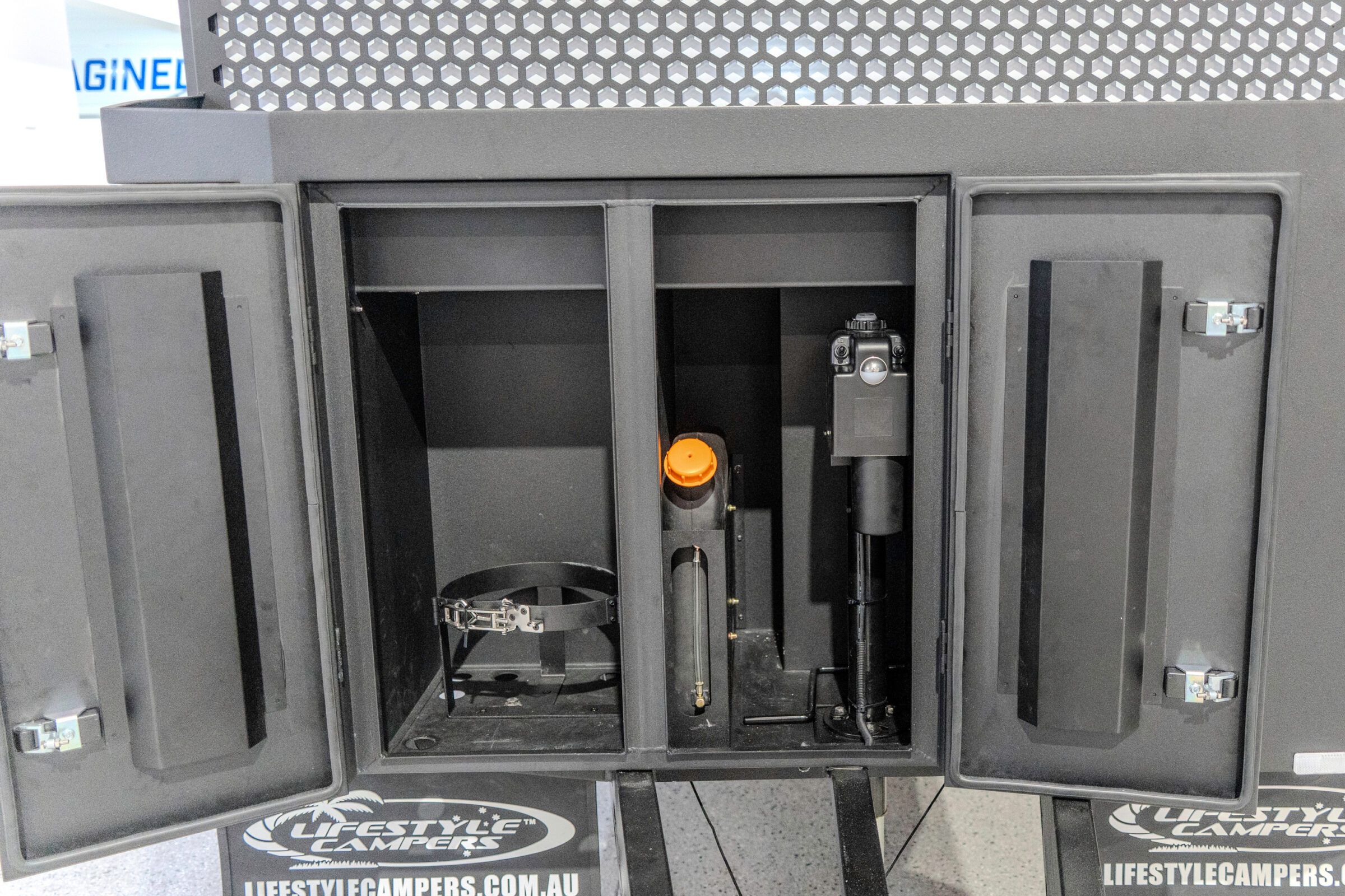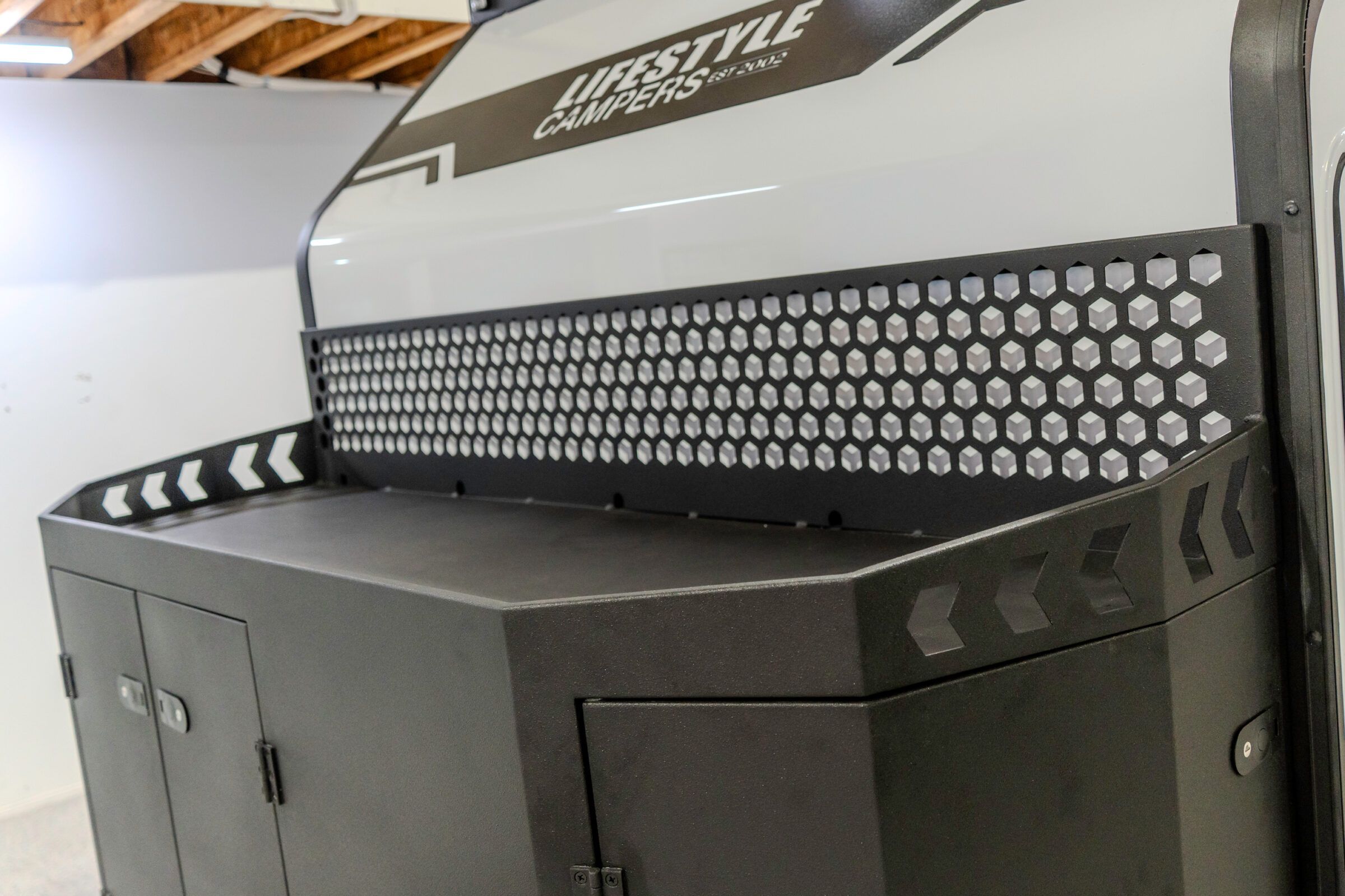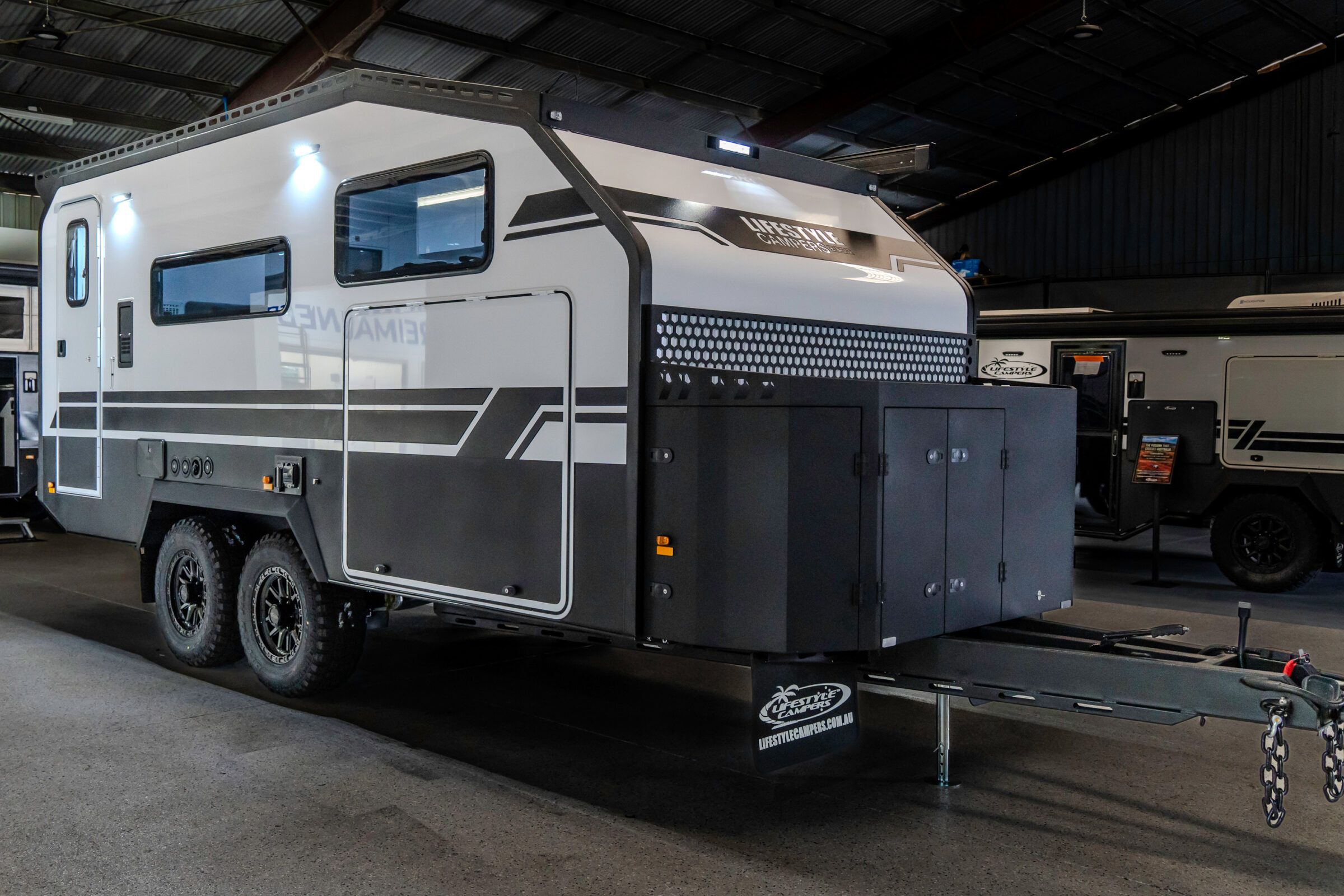 Lifestyle Campers pioneered the external kitchen concept and this design in 2014, reshaping outdoor living. In the Iconn XKT, that legacy is refined. Induction cooking, sink, storage, and tricolour lighting are arranged with precision. The butler’s pantry extends capability with a 72 L upright fridge freezer, deep pantry drawers, roller door storage, integrated power, and a Victron Cerbo touch screen. This is a system refined through evolution.