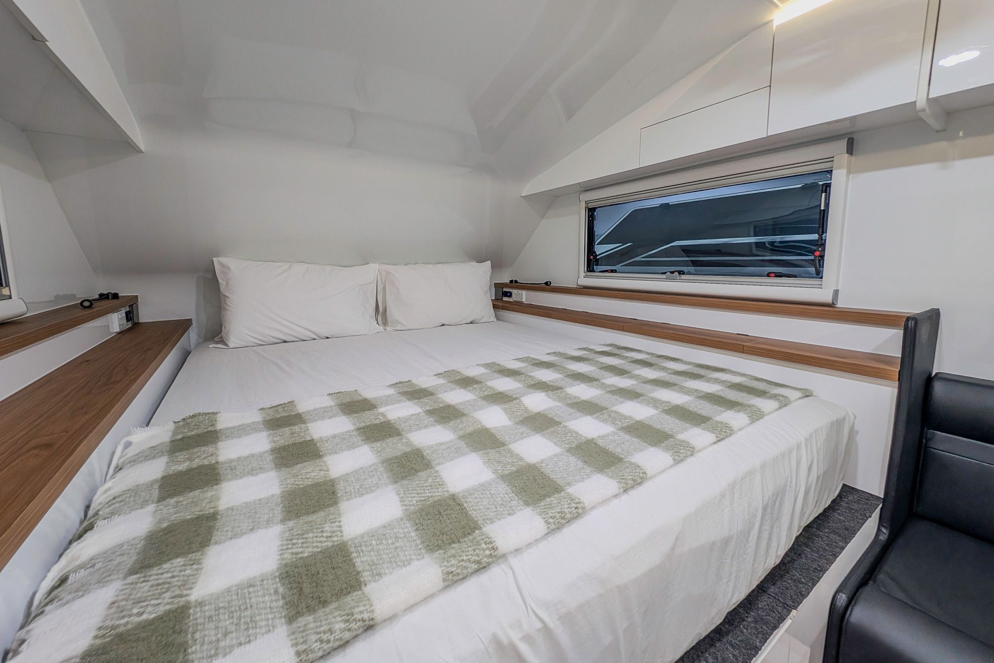 The Iconn XKT features a genuinely large ensuite designed for real use. The shower and toilet are fully separate spaces, improving comfort on extended trips. A composting toilet is included as standard. An optional external entry door to the shower adds flexibility for outdoor use, beach days, or family touring. This is a full scale ensuite, executed with purpose.