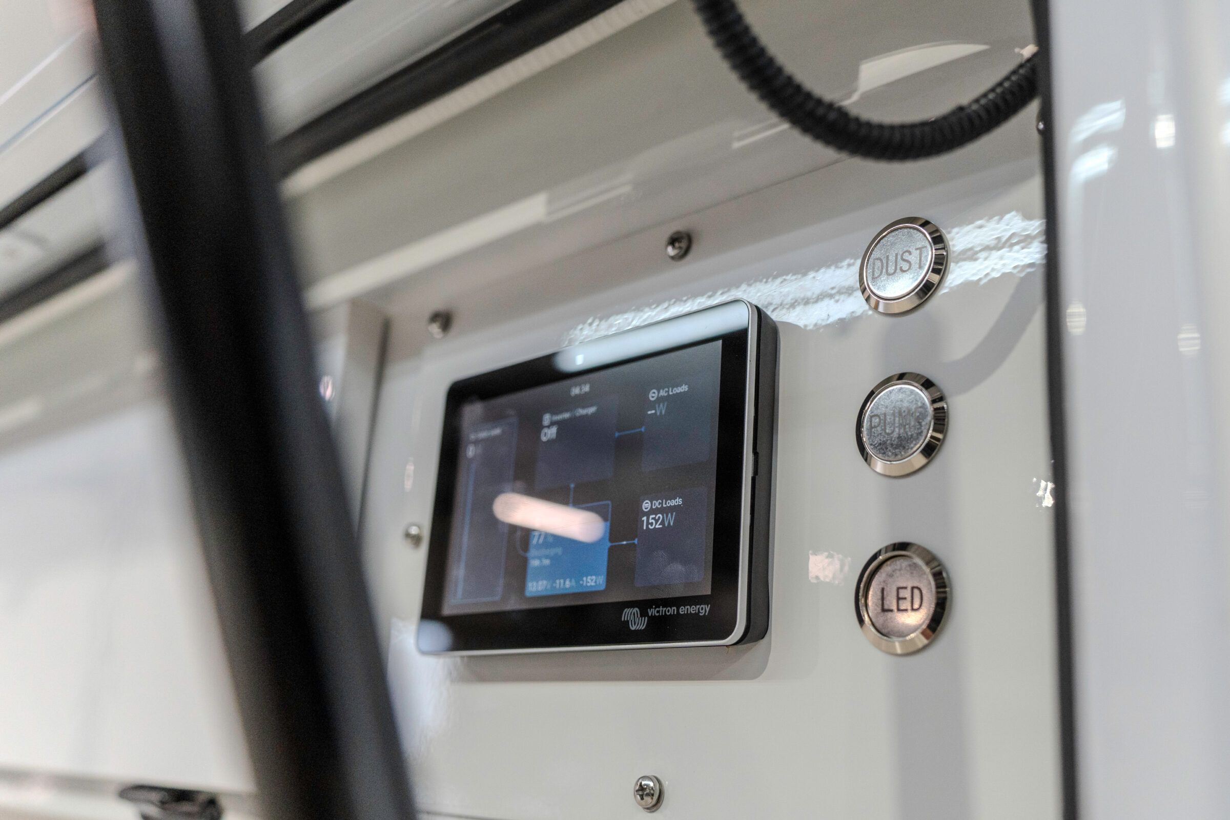 Off grid capability is delivered through an integrated Victron electrical system. A total of 1.32 kW of roof mounted solar from three 440 W panels feeds a premium electrical management board. Dual Victron solar regulators, a Victron 50 A DC to DC charger, and a Victron 3000 VA inverter with 120 A AC charging provide controlled, reliable power. Monitoring is handled via Victron Cerbo and GX Touch with Bluetooth connectivity.