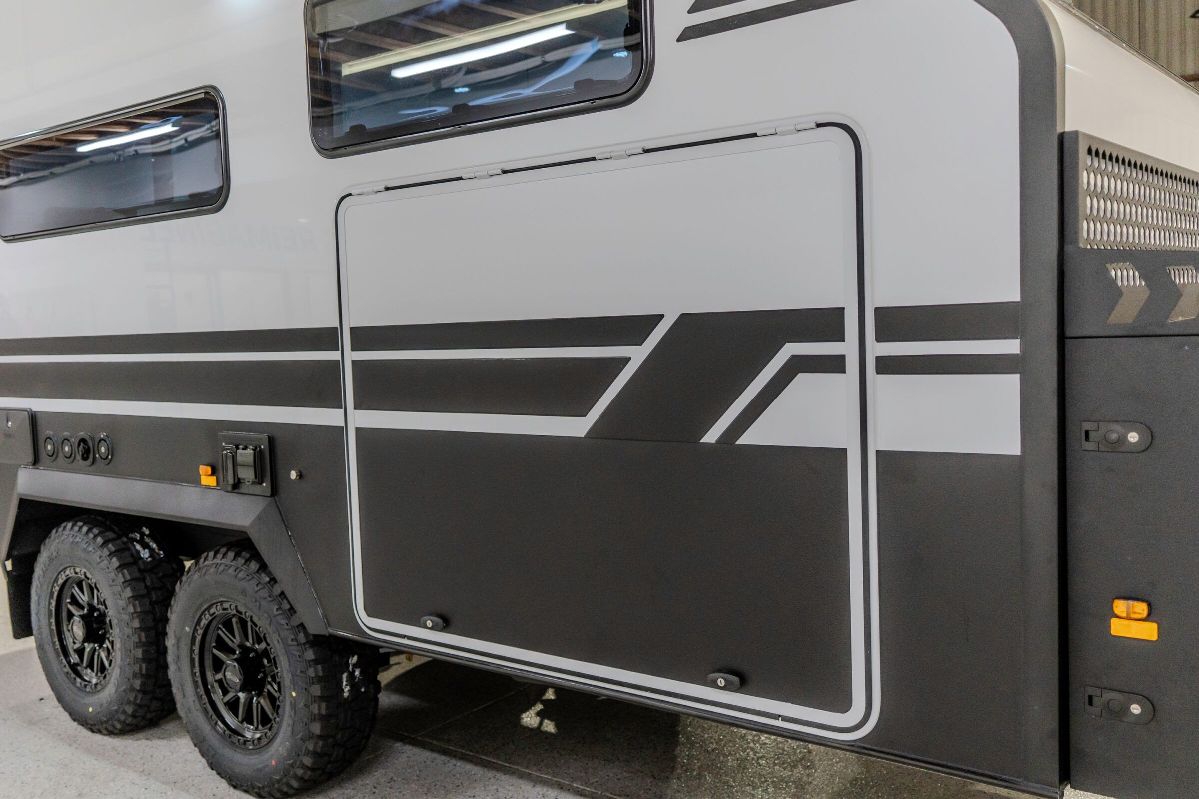 Energy storage is supplied by 7.2kW of lithium capacity via two 300Ah batteries as standard, with provision to expand to 10.8kW. A, external 100 watt USB C outlet supports Starlink use, complemented by USB A, USB C, cigarette sockets, and 240V twin GPOs throughout. A rear Anderson plug enables regulated portable solar input or 12V output.