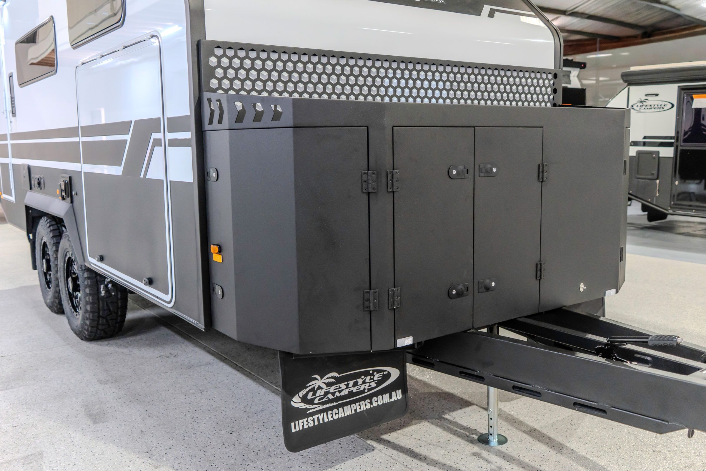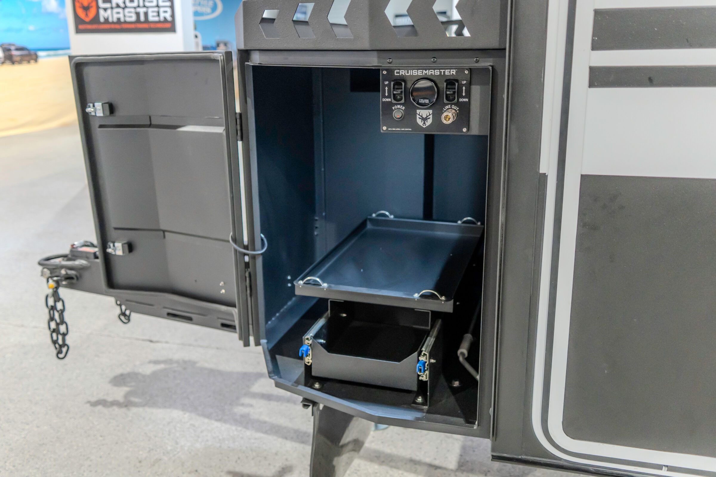 Storage throughout the Iconn XKT is shaped by real travel needs. A large front storage box with utility slide and utensil tray is paired with extensive internal storage. A DO35 off road hitch rated to 3.5 T is supported by an electric jockey wheel and four drop down stabiliser legs. The engineering is deliberate. Inspection in person is encouraged.